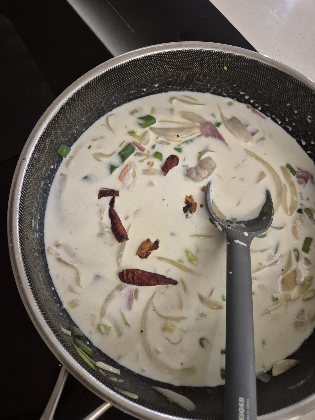 - 베이컨을 넣고 노릇하게 구운 뒤, 생크림과 우유를 붓습니다.