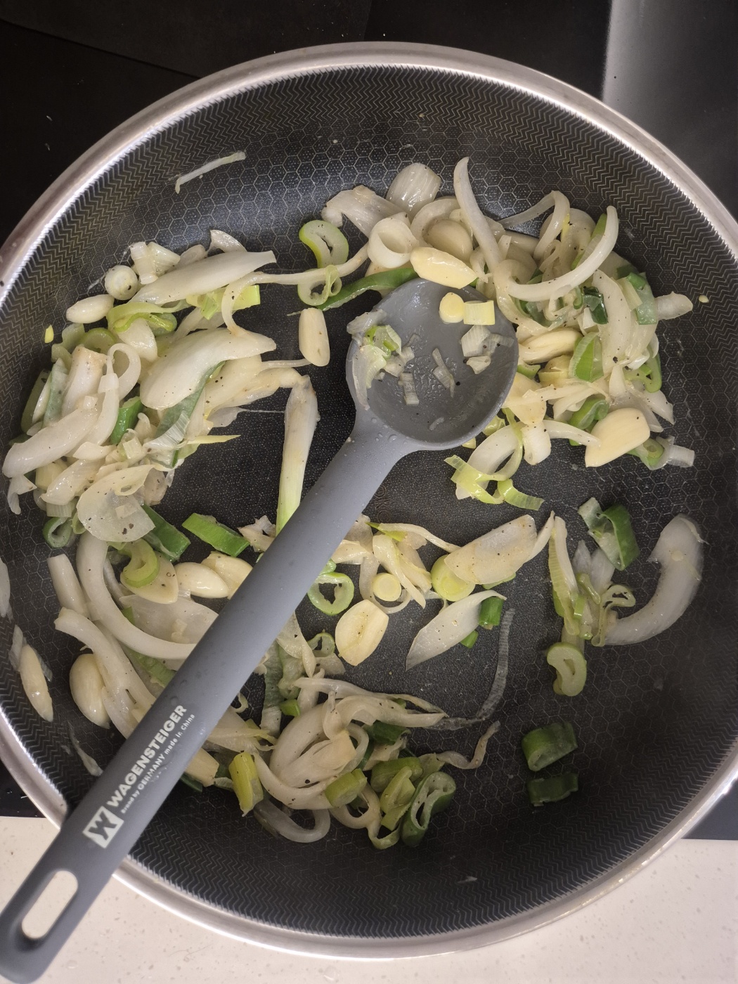 - 팬에 올리브오일을 두르고 약불에서 다진 마늘과 양파와 파를 볶습니다.